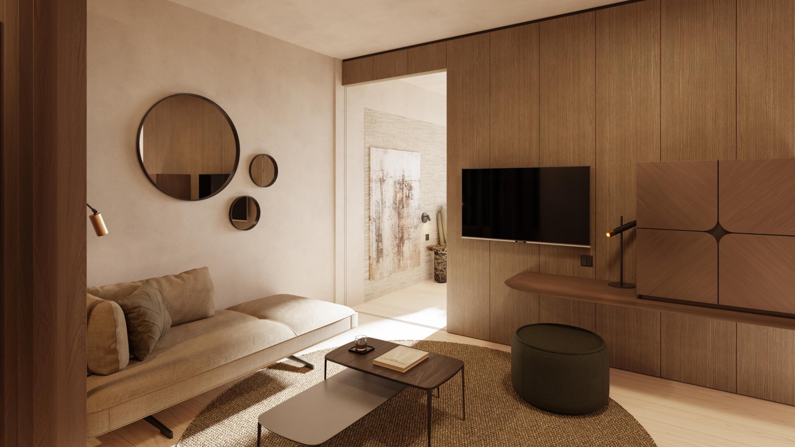 Suite, ca. 50 m², Seeblick, zwei getrennte Schlafzimmer, Elternzimmer mit Ehebett und Kinderzimmer mit zwei getrennten Betten, Wohnbereich vor den Schlafzimmern mit Schreibtisch, Couch, Minibar, Bad mit begehbarer Dusche, Doppelwaschbecken, WC und Bidet getrennt. Möblierter Balkon, TV in jedem Zimmer und im Wohnbereich, Safe, Haarföhn, Direktwahltelefon, Bademantel, Badetasche, Badeschuhe, inklusive Garagenplatz, W-Lan kostenlos im ganzen Hotel.
